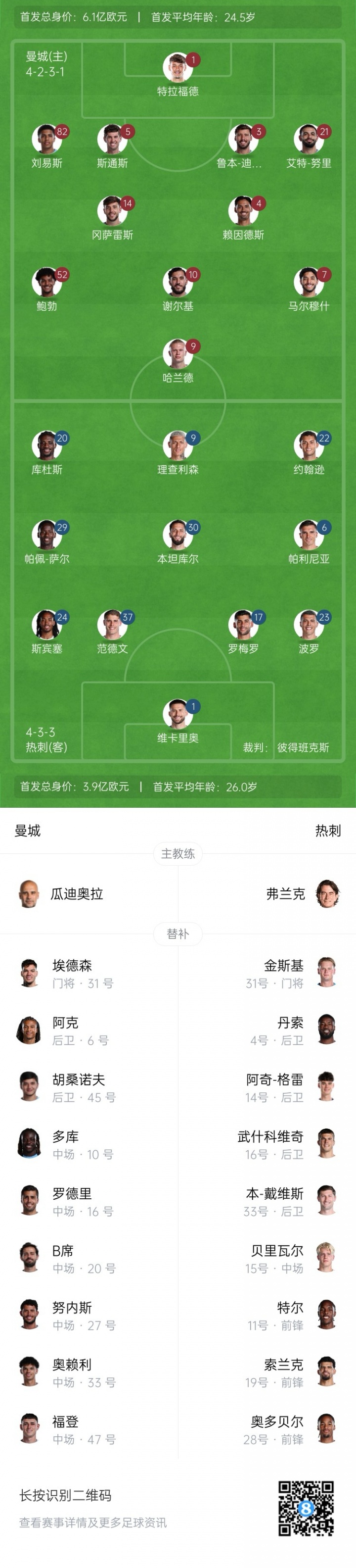 曼城首发:1-特拉福德、82-刘易斯、5-斯通斯、3-迪亚斯、21-努里、14-尼科-冈萨雷斯、4-赖因德斯、52-鲍勃、10-谢尔基、7-马尔穆什、9-哈兰德